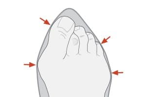 Auslöser vieler Fussbeschwerden kann der sogenannte Spreizfuss sein. (4,5) Bei einem Spreizfuss senkt sich das Quergewölbe, das Gewölbe entlang der Zehengrundgelenke (Metatarsalköpfchen), der Vorfuss verbreitert sich und die Belastung auf die Vorfussknochen wird verändert. Dadurch kann eine Metatarsalgie entstehen (Schmerzen im Vorfussbereich, insbesondere im Bereich der Mittelfussknochen). Je mehr Druck auf die Metatarsalköpfchen wirkt, desto schmerzhafter können die Folgen sein und beispielsweise Hammerzehen, Krallenzehen oder Morton Neurom (Nerveneinklemmungen) können entstehen. (5) Auslöser für Spreizfuss-Fehlstellungen sind unter anderem Bindegewebsschäden, Übergewicht, zu schwache Fuss-Stützmuskulatur und falsches Schuhwerk. Wird ein verbreiterter Spreizfuss in einen zu engen Schuh gequetscht, werden die äussersten Zehen nach innen gedrängt und ein Hallux Valgus kann entstehen. (6)