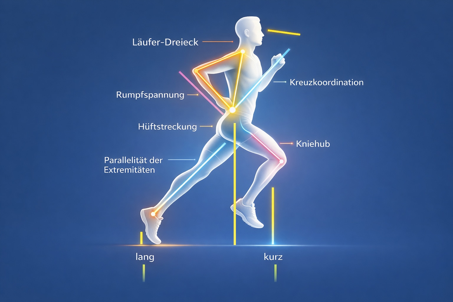 - Für einen effizienten Laufstil ist der Schritt vorne kurz und hinten lang, wobei die Hüfte in der Abdruckphase aktiv gestreckt werden soll. Ein stabiler Rumpf hilft dabei, die Kraft aus Hüfte und Bein gezielt nach vorne zu übertragen und Ausweichbewegungen zu vermeiden.